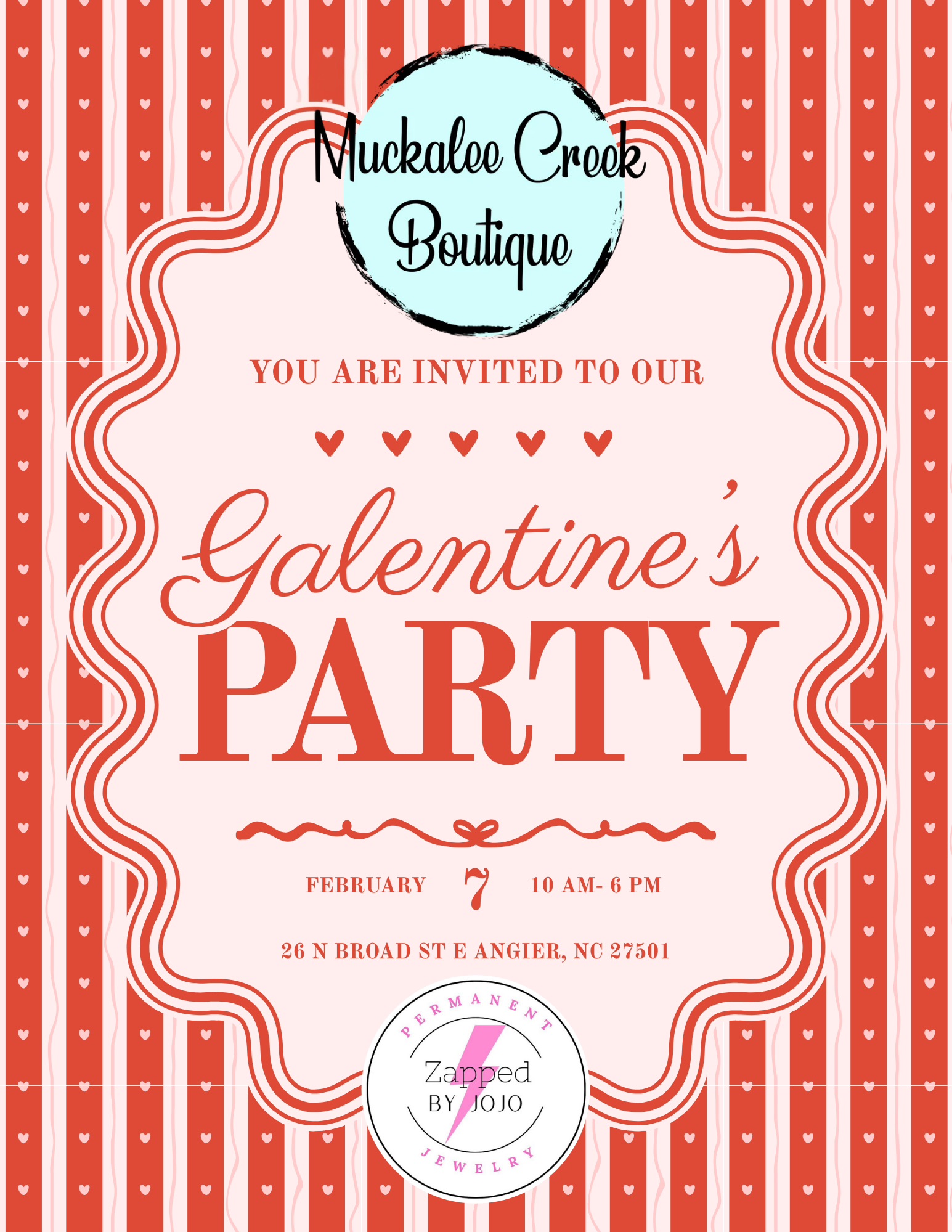 February 7 @ 10:00 am - 6:00 pm Galentine’s Party with Muckalee Creek Boutique Muckalee Creek Boutique 26 North Broad Street East, Angier, NC
